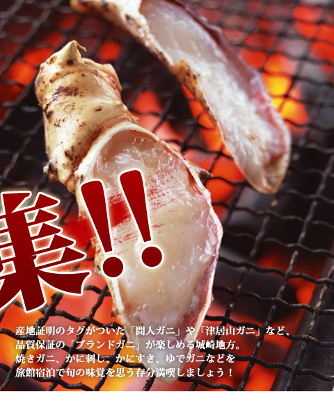カニそのもののおいしさを楽しむなら絶対にコレ! かにを焼く。そして食べる。このシンプルさがカニの味をリアルに感じさせ、 丹後、城崎地方のカニのおいしさを100%伝えてくれます。 焼いたカニは塩、三杯酢、おきて破りはマヨネーズなんていう食べ方も(笑) 城崎温泉を訪れたときは、ぜひ一度お試し下さい。